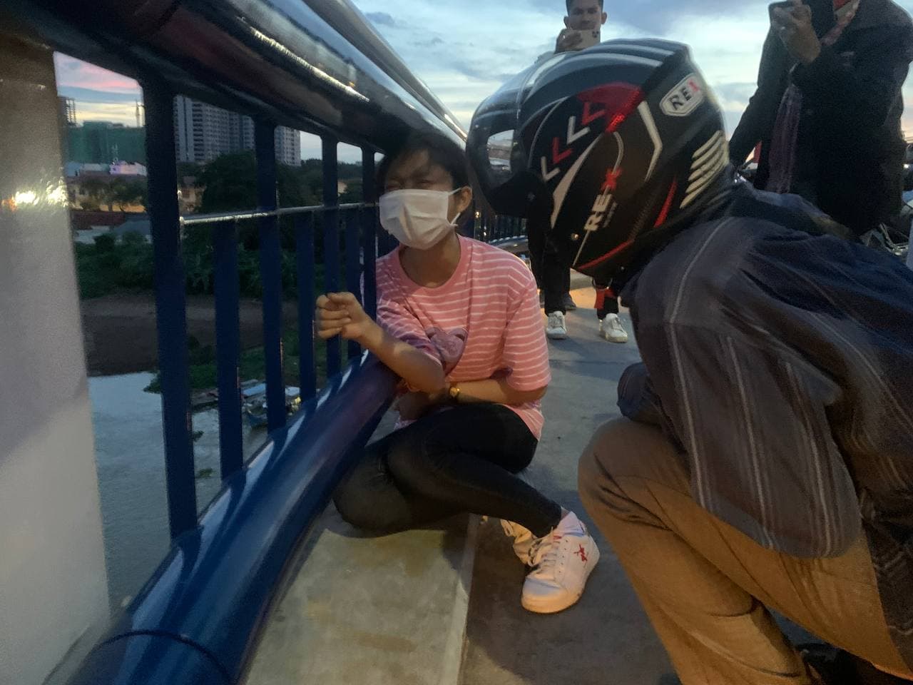 ប្រភពព័ត៌មានដែលឃើញហេតុការណ៍ បានឲ្យដឹងថា នៅវេលាកើតហេតុគេឃើញក្មេងស្រីរងគ្រោះរូបនោះបានឈប់ចុះពីលើម៉ូតូកង់បីមួយគ្រឿងដល់ចំណុចកណ្ដាលស្ពាននាងក៏បានដើរទៅអង្គុយយំព្រមទាំងដៃកាន់ទូរសព្ទដៃ បំណងនឹងលោតទឹកសម្លាប់ខ្លួនដោយឃើញដូច្នេះប្រជាពលរដ្ឋរួមអ្នកធ្វើដំណើរក៏បាននាំគ្នាចុះឃាត់ព្រមទាំងបោះដៃហៅកម្លាំងសមត្ថកិច្ចប្រចាំការគល់ស្ពានរួមជាមួយសមត្ថកិច្ចមូលដ្ឋានប៉ុស្តិ៍ស្រះចកឱ្យចុះមកដល់កន្លែងកើតហេតុនាំគ្នាធ្វើការចាប់ឃាត់ក្មេងស្រីរងគ្រោះរូបនោះ ដោយនាងបានយំននាលដីមិនព្រមឲ្យកម្លាំងសមត្ថកិច្ចឃាត់រូបនាងនោះទេ ព្រមទាំងព្យាយាមមិនឲ្យសមត្ថកិច្ចយកទូរសព្ទពីដៃរបស់នាងទៀតផង ដោយឃើញដូច្នេះសមត្ថកិច្ចក៏នាំគ្នាសម្រេចចាប់នាងលើកដាក់ម៉ូតូដឹកចេញពីលើស្ពានដើម្បីបញ្ចៀសការកកស្ទះរួមទាំងការចោមរោមមើលរបស់អ្នកដំណើរផងនោះ ក៏នាំនាងមកកាន់ប៉ុស្តិ៍ស្រះចកដើម្បីធ្វើការលួងលោមសួរនាំពីរឿងហេតុនៃការប៉ុនប៉ងលោតទឹកនោះផងដែរ។